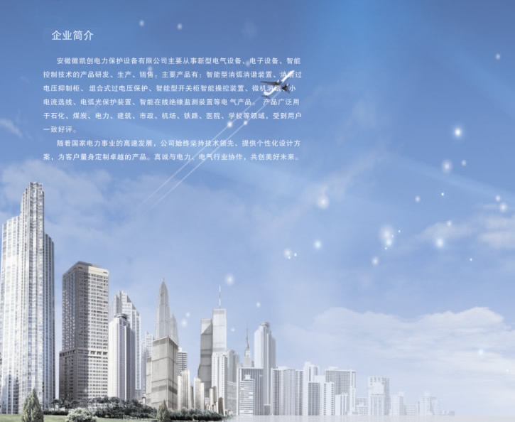 安徽徽凱創電力保護設備有限公司主要從事新型電氣設備、電子設備、智能控制技術的產品研發、生產、銷售。主要產品有:智能型消弧消諧裝置、消諧過電壓抑制柜、 組合式過電壓保護、智能型開關柜智能操控裝置、微機消諧、小電流選線、電弧光保護裝置、智能在線絕緣監測裝置等電氣產品。 產品廣泛用于石化、煤炭、電力、建筑、市政、機場、鐵路、醫院、學校等領域,受到用戶一致好評。