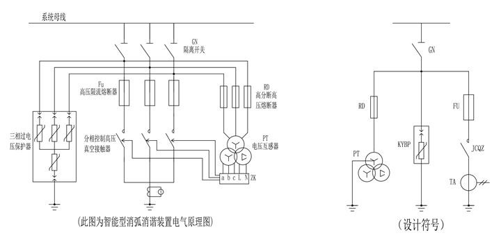?過電壓保護功能;當系統發生內部過電壓和大氣過電壓,由消弧柜內的過電壓保護器將電壓限制到設備絕緣允許的水平。系統發生單相弧光接地故障時,消弧柜動作后可將非故障相的弧光接地過電壓限制到線電壓的水平。